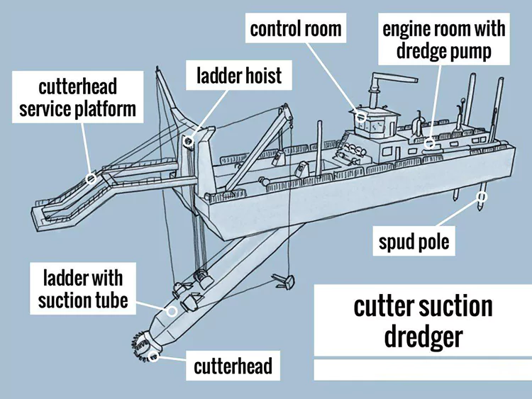Його основні структури включають систему різання, систему всмоктування та нагнітання, систему позиціонування та переміщення, а також систему живлення, що забезпечує інтегровані операції «розкопки-транспортування-розвантаження». Він широко використовується в проектах з днопоглиблення річок і рекультивації.。